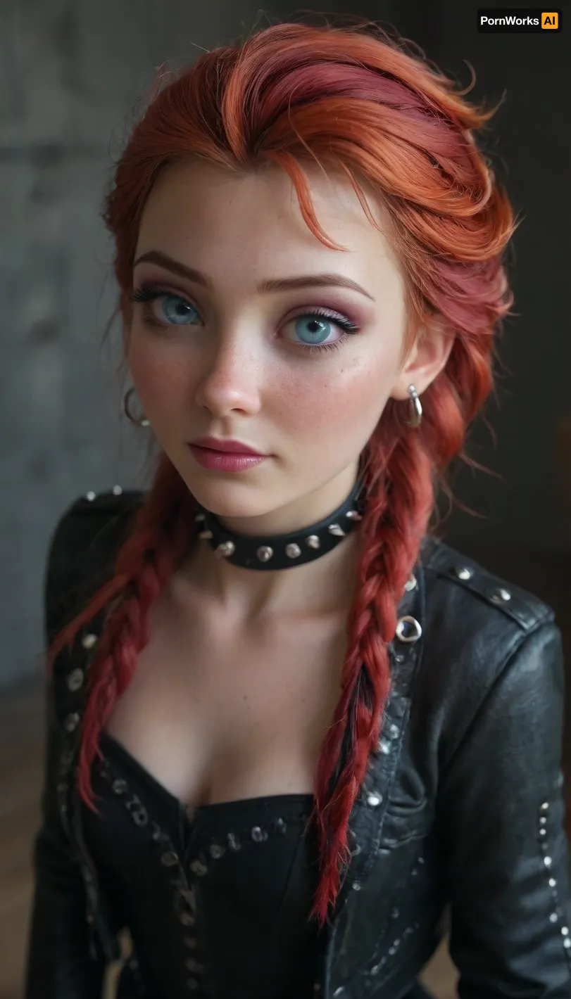 (((((Anna of Arendelle from frozen red hair))))), wearing a high-necked black velvet jacket, collar with large spikes, black tulle skirt, punk, 80s, clothing, hardcoresex (((((Anna of Arendelle from frozen red hair))))), wearing a high-necked black velvet jacket, collar with large spikes, black tulle skirt, punk, 80s, clothing, hardcoresex