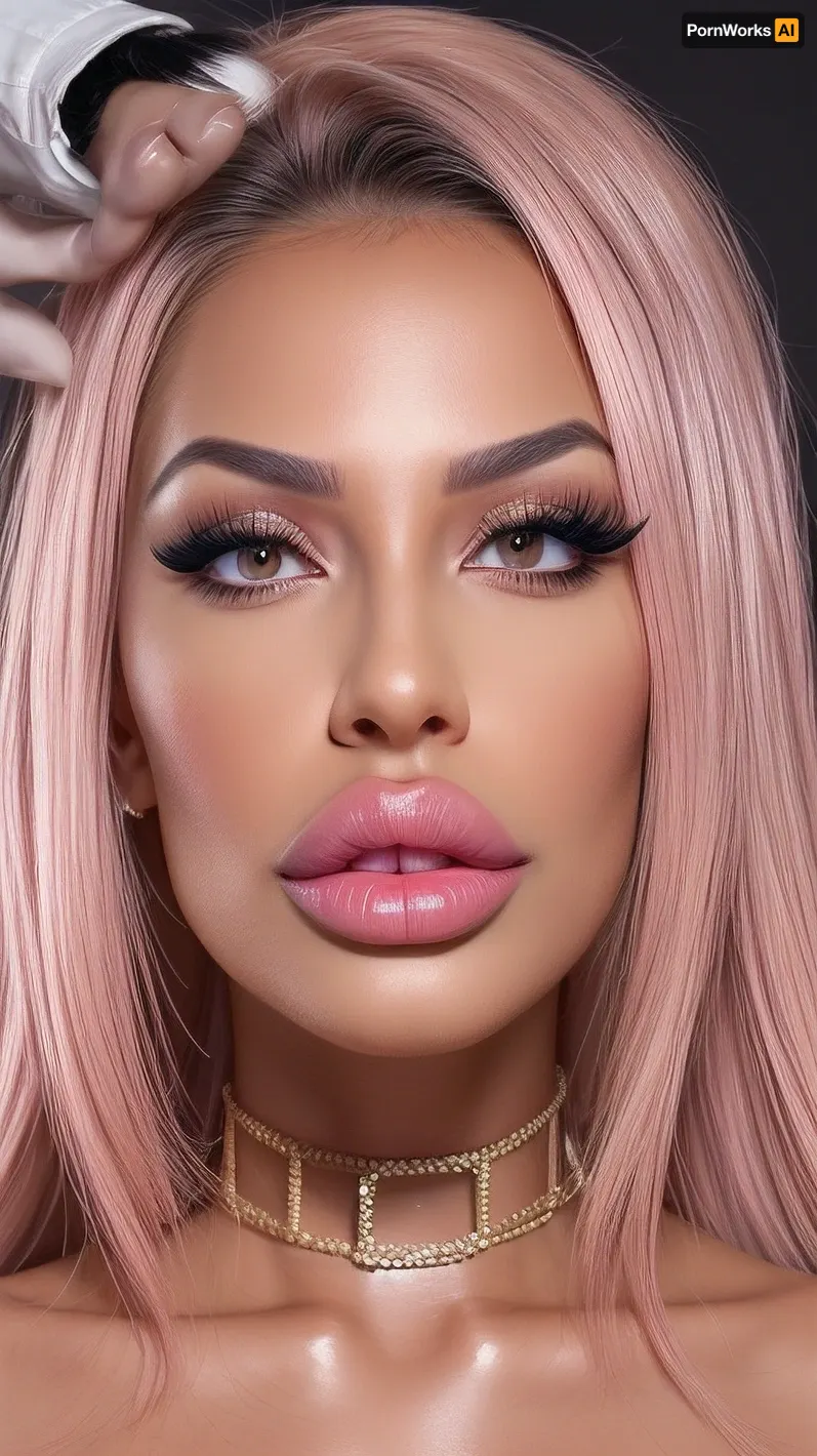 bimbo, black hair, best portrait photo, bolt on lips, tanned skin, one Person reflecting skin, moist lips, collar bone, slim shoulders, ultra plump lips, ultra snatched face, botoxfacelift, antiageing, ultra cosmetic surgery, bright eyes, botox eyes, ultra glass skin, foxy eyes, perfect glass skin, flawless skin, Glistering skin, glistering lips, at a party, pouting lips, flaunting lips, looking up at viewer, eye contact, long fake eyelashes, slutty make up, lip gloss, pink, flirting with the host, ultra high quality, doing bimbo things, fresh cosmetic surgery, high detailed skin, 8K, HDR light, detailed skin texture, highly detailed hair, hair extensions, highly detailed face, insanely detailed, highest quality, hyperrealistic, <lora:lips:.4>, <lora:BimbolipsV3-000004:.4>