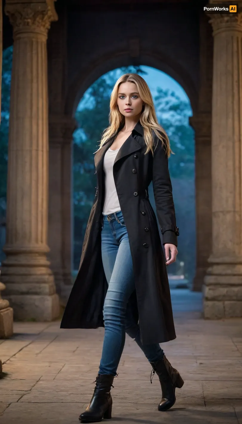 1 Girl, (32 Years old, FULL BODY, Clonated face), (Medium breasts, Neat figure), (Blue eyes, Glowing eyes), (Long hair, Straight hair, Blonde), (In a mysterious ancient temple at midnight), (Sleeveless black trench coat with a crossover design, mid-calf jeans, combat boots), (Extrem long shot, Panoramic shot of her, FULL BODY) 1 Girl, (32 Years old, FULL BODY, Clonated face), (Medium breasts, Neat figure), (Blue eyes, Glowing eyes), (Long hair, Straight hair, Blonde), (In a mysterious ancient temple at midnight), (Sleeveless black trench coat with a crossover design, mid-calf jeans, combat boots), (Extrem long shot, Panoramic shot of her, FULL BODY)