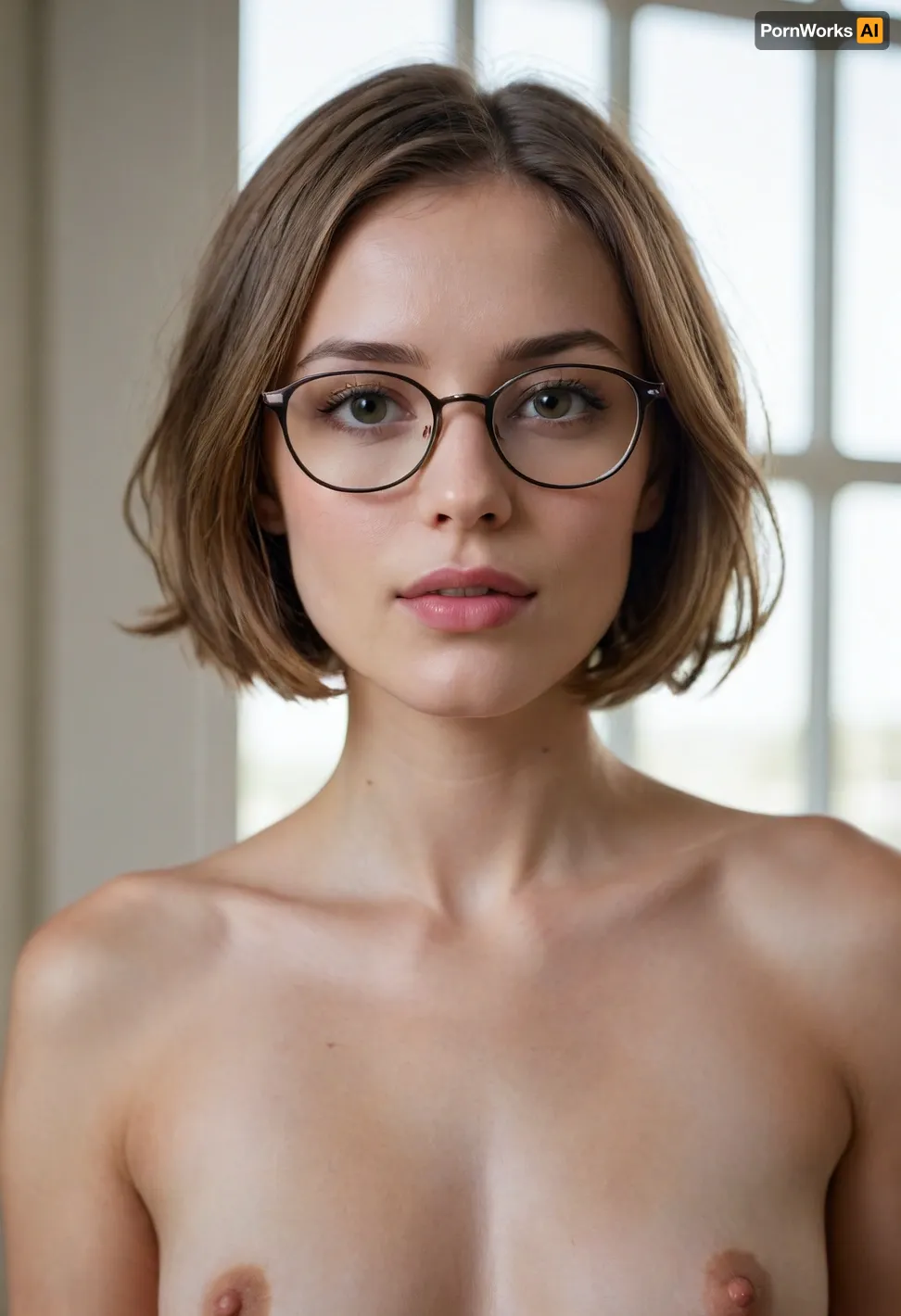 a high-resolution photograph of a young naked woman with light skin and a slender physique, small breasts, she has a straight, shoulder-length bob haircut with a slight wave, framing her face, her facial features are delicate, with high cheekbones, full lips, and almond-shaped glasses that add a touch of intellectualism to her appearance, the background features a bright, sunlit room with large windows that allow natural light to flood in, illuminating the room and casting soft shadows, the windows are framed by white walls, and there are blurred, suggesting a cozy, indoor setting, the overall mood of serene and intimate, with a focus on the subject's natural beauty and simplicity a high-resolution photograph of a young naked woman with light skin and a slender physique, small breasts, she has a straight, shoulder-length bob haircut with a slight wave, framing her face, her facial features are delicate, with high cheekbones, full lips, and almond-shaped glasses that add a touch of intellectualism to her appearance, the background features a bright, sunlit room with large windows that allow natural light to flood in, illuminating the room and casting soft shadows, the windows are framed by white walls, and there are blurred, suggesting a cozy, indoor setting, the overall mood of serene and intimate, with a focus on the subject's natural beauty and simplicity