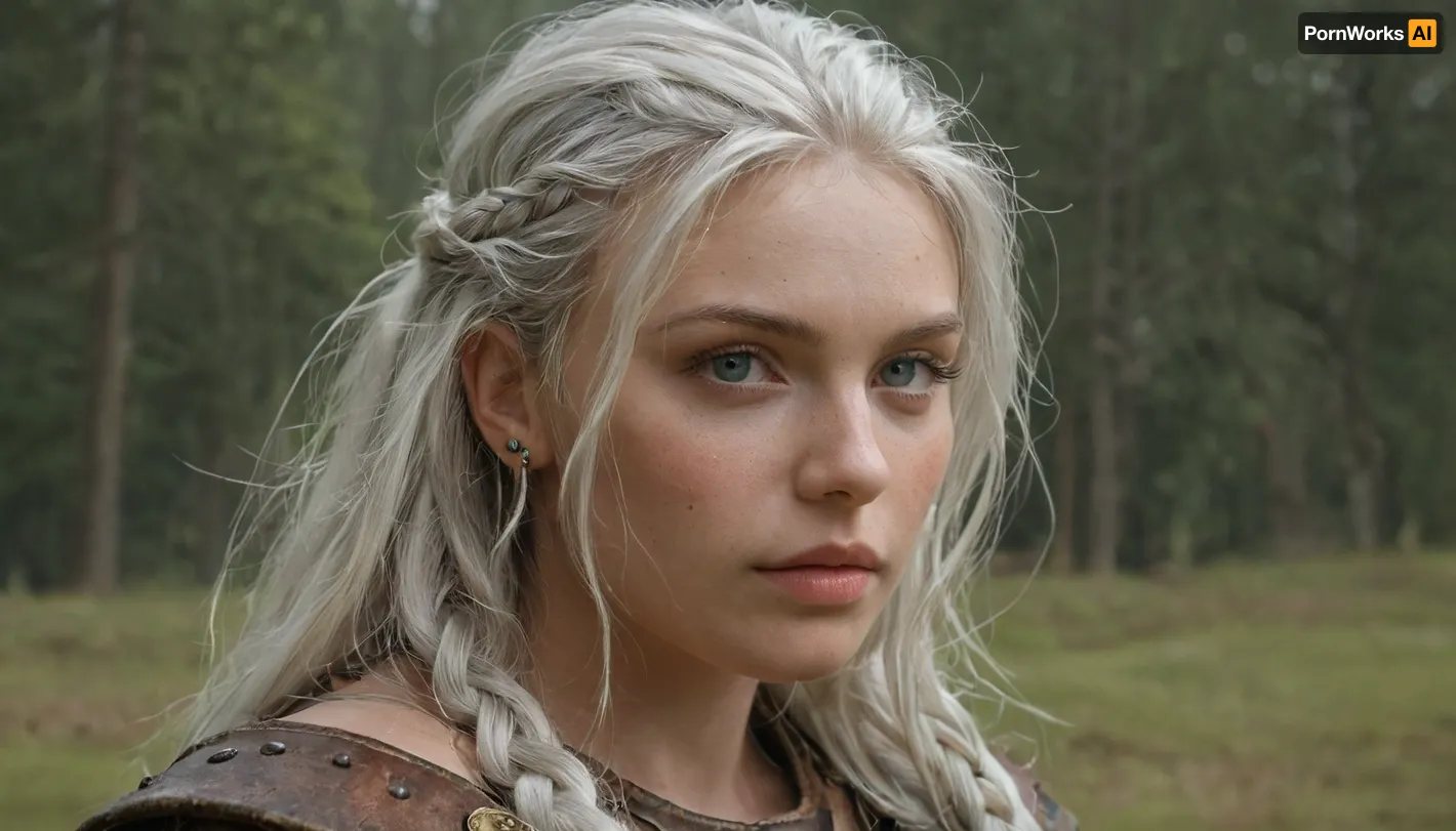 Masterpiece, realistic photography, ultra-realistic, detailed body, detailed face, realistic body, realistic face, angelic face, viking warrior, viking woman hairstyle, 30 years old, viking braid, silver hair, serious look, peaceful face, woman, viking, viking outfit, realistic outfit, war painting, close-up face, cinematic blur, background blur, large format