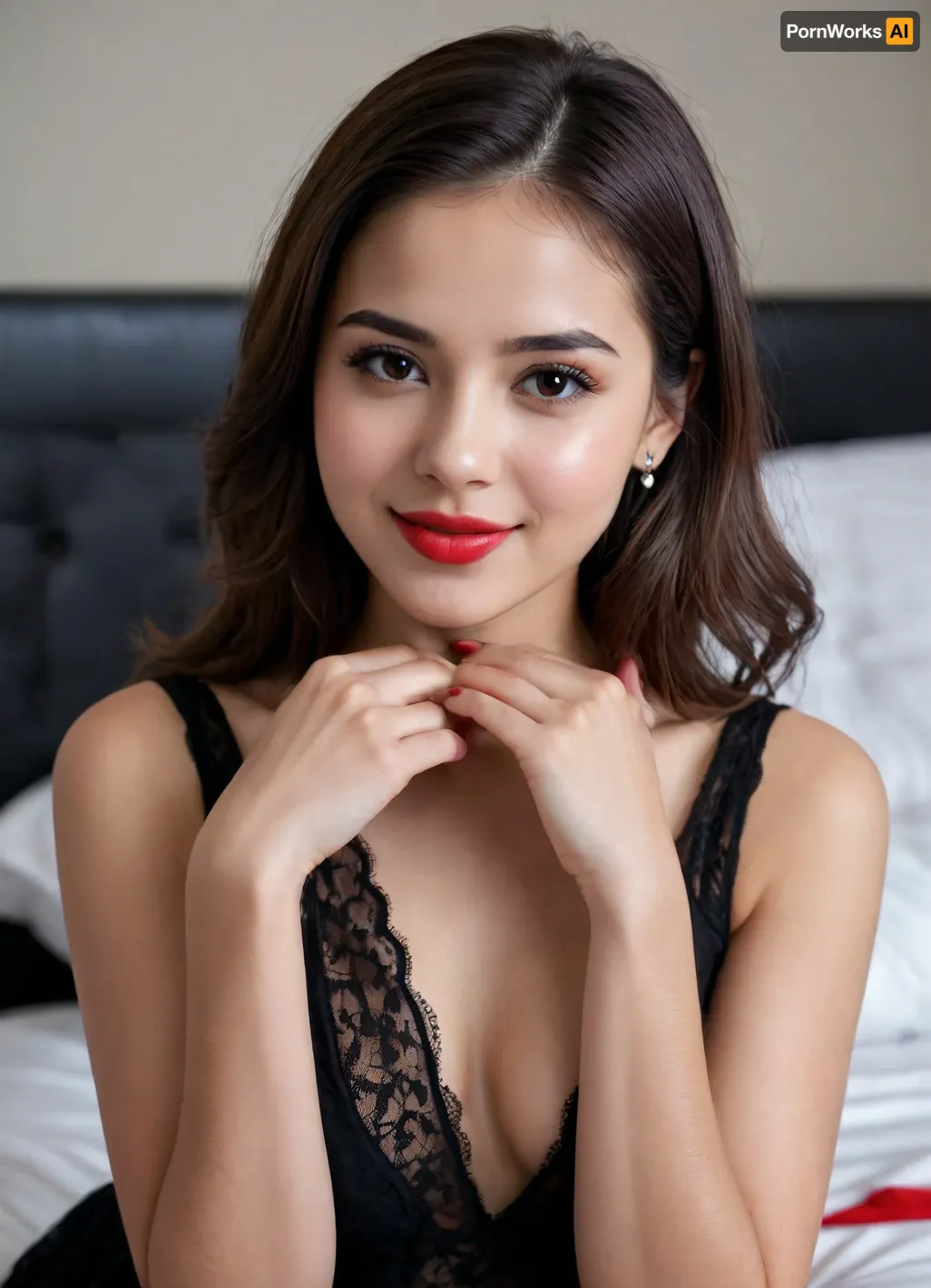 close-up portrait of Urassaya Sperbund 18 year old, beautiful sexy, (skinny), (Brunette), posing in a short black dress, (very sexy horny), smile, bobcut, standing by her bed, lipstick, good hands, perfect fingers, red polish close-up portrait of Urassaya Sperbund 18 year old, beautiful sexy, (skinny), (Brunette), posing in a short black dress, (very sexy horny), smile, bobcut, standing by her bed, lipstick, good hands, perfect fingers, red polish