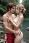 Break A beautiful woman with a perfect fit muscular body wearing a bikini. Break a blonde slender man in swim trunks break they are holding each other in an embrace., (Fondling genitals:1.8)