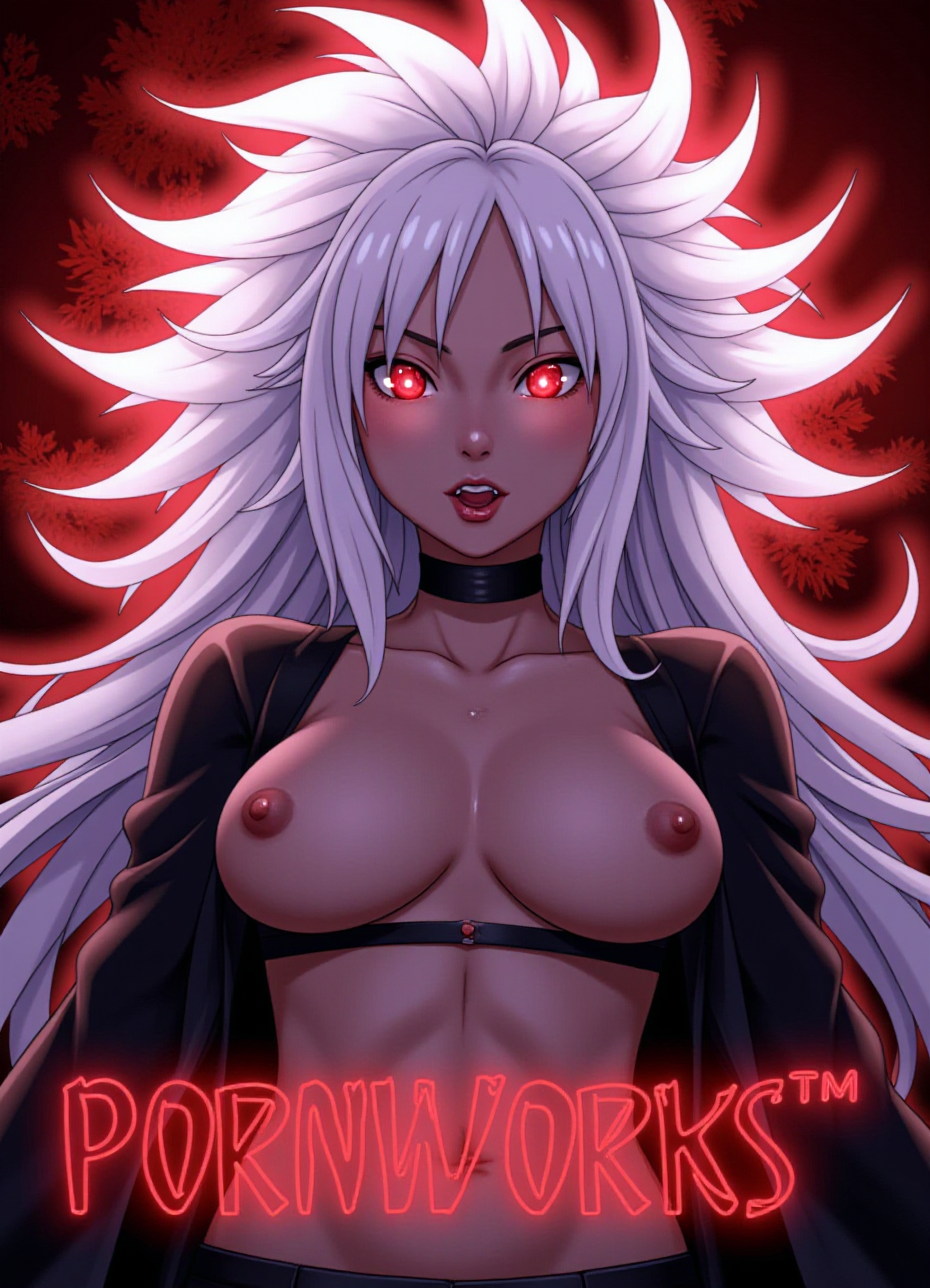 Яростная молодая сексуальная девушка, неоновая надпись "PORNWORKS", ночной бар, девушка-суккуб, вампир, средняя обнаженная грудь, красные глаза,