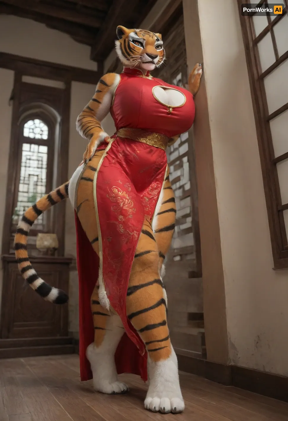 Tigress from Kung fu panda, Anthro woman, furry girl, 1girl, gigantic breasts, full body, huge ass, ideal body, high detail's, 2 leg, 5 finger, white Chinese palace, 4K quality, red Chinese cutout dress, bottom view, leaned her foot against the wall Tigress from Kung fu panda, Anthro woman, furry girl, 1girl, gigantic breasts, full body, huge ass, ideal body, high detail's, 2 leg, 5 finger, white Chinese palace, 4K quality, red Chinese cutout dress, bottom view, leaned her foot against the wall