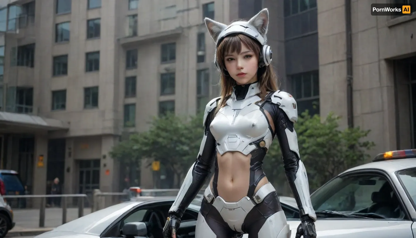 The hood of the car is painted red and white. The reflection of the surrounding landscape is visible in the transparent dome above the hood. Inside, you can make out a steering wheel., mecha, <lora:mecha-000009 (1):.8>, flat, chested, <lora:flat_chested_v3.5:.8>, <lora:Thigh_gap_SDXL:.8>, <lora:ahxl_v1:.8> (((Very Petite girl))), . The image shows a young, thin woman in a futuristic suit standing on a police car. She is dressed in white and gray armor, with an open torso. On her head she has a helmet with ears, similar to a cat's. On her left hand is a mechanical device with several fingers. She is standing with one foot resting on the hood of the car, and the other on the fender.