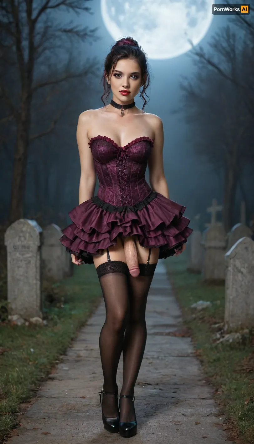 solo gothic futanari posing in a graveyard, perfect tall body, long legs, intricate long black hair, hair in Classic low curly updo, ((magenta satin full corset, magenta mid-thigh satin skirt with ruffles, petticoat)), (erect penis inside black transparent panties, scrotum), ((skirt very scrunched up, skirt pulled up shows erect penis)), black stockings, garter belt, stockings, high heels platform, ((chest Gothic Cross Choker, red lips, vampire fangs, fang points visible, bare arms)), ((sexy slut poses)), (full moon, nighttime), (detailed face, detailed hair:1.1), cinematic lighting, 8k, masterpiece, (realism:1.1), (realistic:1.1), (hyper realistic:1.1), (ultra realistic:1.1), fair skin, ((high detailed skin)), high quality, detailed skin texture, (highly detailed hair), highly detailed body, insanely detailed, highest quality solo gothic futanari posing in a graveyard, perfect tall body, long legs, intricate long black hair, hair in Classic low curly updo, ((magenta satin full corset, magenta mid-thigh satin skirt with ruffles, petticoat)), (erect penis inside black transparent panties, scrotum), ((skirt very scrunched up, skirt pulled up shows erect penis)), black stockings, garter belt, stockings, high heels platform, ((chest Gothic Cross Choker, red lips, vampire fangs, fang points visible, bare arms)), ((sexy slut poses)), (full moon, nighttime), (detailed face, detailed hair:1.1), cinematic lighting, 8k, masterpiece, (realism:1.1), (realistic:1.1), (hyper realistic:1.1), (ultra realistic:1.1), fair skin, ((high detailed skin)), high quality, detailed skin texture, (highly detailed hair), highly detailed body, insanely detailed, highest quality