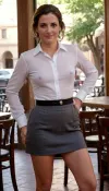In this captivating full body-shot, a stylish yet very sexy and beautiful Italian woman in her 50s stands elegantly in a rustic cafe in Rome's historic city square, bathed in warm sunlight. Framed from the side, She wears a crisp white wide opened collared shirt.The bountiful DD-Cup breasts overflows the opened shirt straining the buttons. Her black short mini skirt exudes confidence and poise. A subtle yet alluring smile beckons the viewer into the scene, as she gazes out into the historic surroundings., braless, Wearing, clothes, that, make, sense, with, Braless>, <lora:bralessSDXL_v1_00022:1.1>