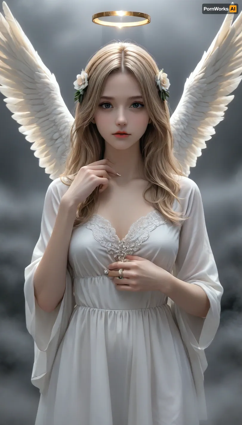 UHD 8K, extreme realism, cinematic, maximum detail, 500000000 billion year old woman, outdoors, (nighttime:1.8), (fog:1.8), single light source above and behind, view from below, making eye contact, ((monochrome:1.5)), ((black and white only:1.5)), descending, levitation, angel, angelic, beautiful, perfect face, flowing white robe, extremely long blonde hair, flower in hair, white and gold wings, glowing halo, beams of light, extending hand., NEGATIVE_HANDS, <lora:Detailed_female_hands-000001:2> UHD 8K, extreme realism, cinematic, maximum detail, 500000000 billion year old woman, outdoors, (nighttime:1.8), (fog:1.8), single light source above and behind, view from below, making eye contact, ((monochrome:1.5)), ((black and white only:1.5)), descending, levitation, angel, angelic, beautiful, perfect face, flowing white robe, extremely long blonde hair, flower in hair, white and gold wings, glowing halo, beams of light, extending hand., NEGATIVE_HANDS, <lora:Detailed_female_hands-000001:2>