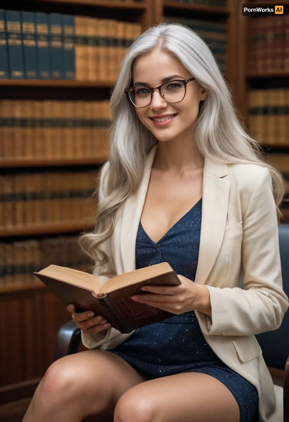 Elegant librarian. Long silver hair. Tilted glasses. Library. Holding a tome. Upskirt. Exposed vagina and anus. Galaxy-like eyes. Warm smile.