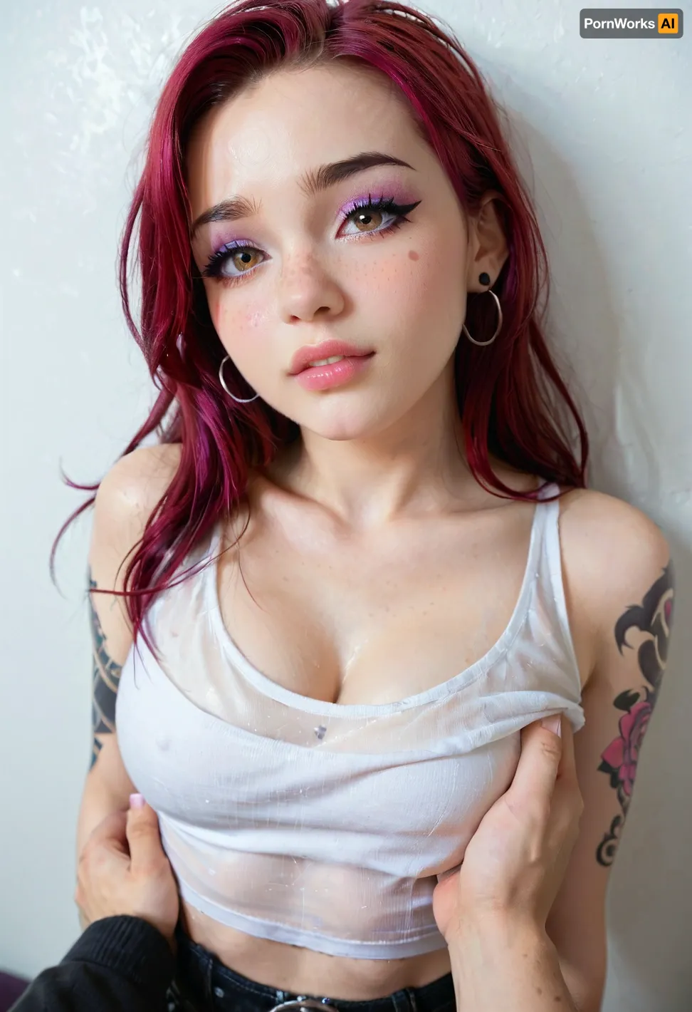 Девушка прислонилась к стене, ее застенчивость очевидна, поскольку она избегала зрительского контакта с мужчиной. Ее грязная прическа и удары акцентировали ее милое, но сексуальное лицо, привлекая его внимание. Она нервно кусала губу, ее карие глаза мерцали между застенчивыми взглядами и застенчивыми представлениями. Несколько веснушек украшали ее щеки, добавляя к ее уникальному очарованию. Безбрежный белый верх, который она носила, выделял ее маленькие, круглые, твердые груди, которые она ловко хватала, пытаясь скрыть их от глаз.
