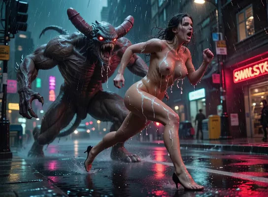 В леденящей душу сцене молодая женщина с длинными рыжими волосами и рваной розовой блузкой привязана к изголовью, руки связаны за спиной. Три огромных человека окружают ее, их проницательные лица наполнены жадностью, когда они навязываются ей. Женщина, хотя и в ужасе, сохраняет идеальное лицо, ее черты застыли в смеси шока и боли. Мужчины, каждый с толстыми петухами, по очереди нарушают ее, их действия подпитываются ненасытной жаждой власти и контроля. Комната, освещенная лишь тусклым светом из небольшого окна, улавливает суть этого кошмара, разворачивающегося перед ней.
