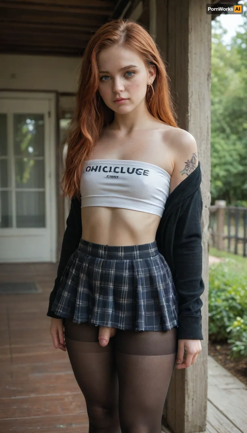 Caucasian beauty, 28 years old, pale skin, oversized thick thighs. Femboy, small penis buldge, wide hips. Big fat ass. Blue eyes, flat chest, medusa piercing, freckles, red hair, ginger, shoulder-length hair, round face, sleeve tattoo, (wearing a mini skirt, pantyhose and off-shoulder top), on a porch, trees in background, chapp3ll, orange, hair, bangs, blue, eyes, <lora:1369490_training_data:.8> Caucasian beauty, 28 years old, pale skin, oversized thick thighs. Femboy, small penis buldge, wide hips. Big fat ass. Blue eyes, flat chest, medusa piercing, freckles, red hair, ginger, shoulder-length hair, round face, sleeve tattoo, (wearing a mini skirt, pantyhose and off-shoulder top), on a porch, trees in background, chapp3ll, orange, hair, bangs, blue, eyes, <lora:1369490_training_data:.8>