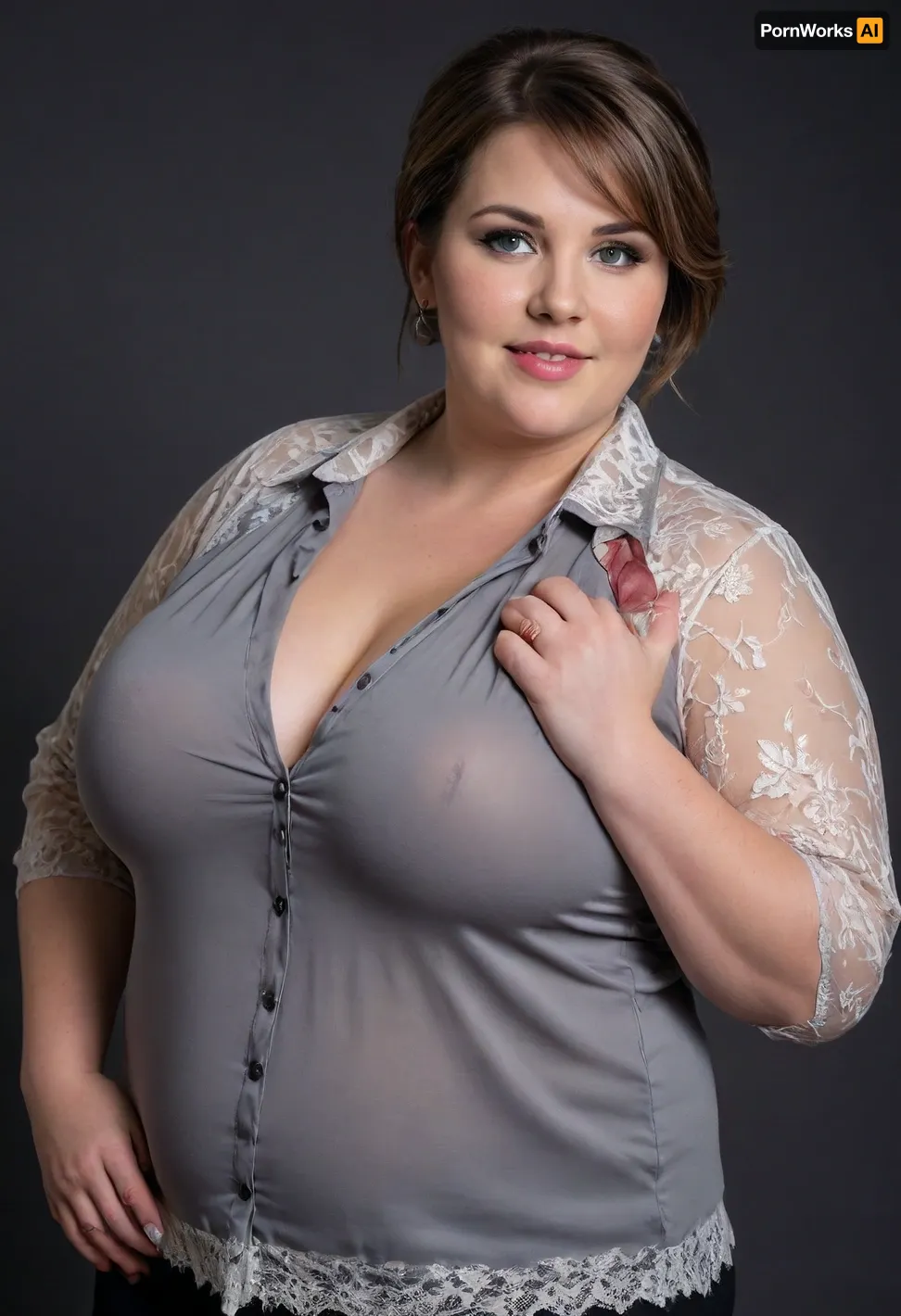 (Close-up:1.4), focus on cleavage, portrait photo a chubby woman, (ssbbw:1.2), perfect face, ((fat ginormous huge bosom, very limp)), ((oversized cloths, dreamy lace)), tulle, presenting cleavage, fat round face, flushed cheeks, double chin, strong jawline, strong broad fat shoulders, fat strong arms, 30 years old milf, blue eyes, (light brunette pixie haircut), (straight hair), joyful smile, looking at viewer, (leaning towards viewer), (solid dark grey background:1.3), low level shoot, film grain, style by Flora Borsi, OverallDetail, (fully clothed), ((loose, see through oversized shirt)), leaning, forward, ((shot from side)), plump, skindentation, chubby, bbw, venus, body, sfw, large, breasts, big, boobs, huge, tits, <lora:Chubby BBW - XL:.8>, <lora:bombshell_v2:.8> (Close-up:1.4), focus on cleavage, portrait photo a chubby woman, (ssbbw:1.2), perfect face, ((fat ginormous huge bosom, very limp)), ((oversized cloths, dreamy lace)), tulle, presenting cleavage, fat round face, flushed cheeks, double chin, strong jawline, strong broad fat shoulders, fat strong arms, 30 years old milf, blue eyes, (light brunette pixie haircut), (straight hair), joyful smile, looking at viewer, (leaning towards viewer), (solid dark grey background:1.3), low level shoot, film grain, style by Flora Borsi, OverallDetail, (fully clothed), ((loose, see through oversized shirt)), leaning, forward, ((shot from side)), plump, skindentation, chubby, bbw, venus, body, sfw, large, breasts, big, boobs, huge, tits, <lora:Chubby BBW - XL:.8>, <lora:bombshell_v2:.8>