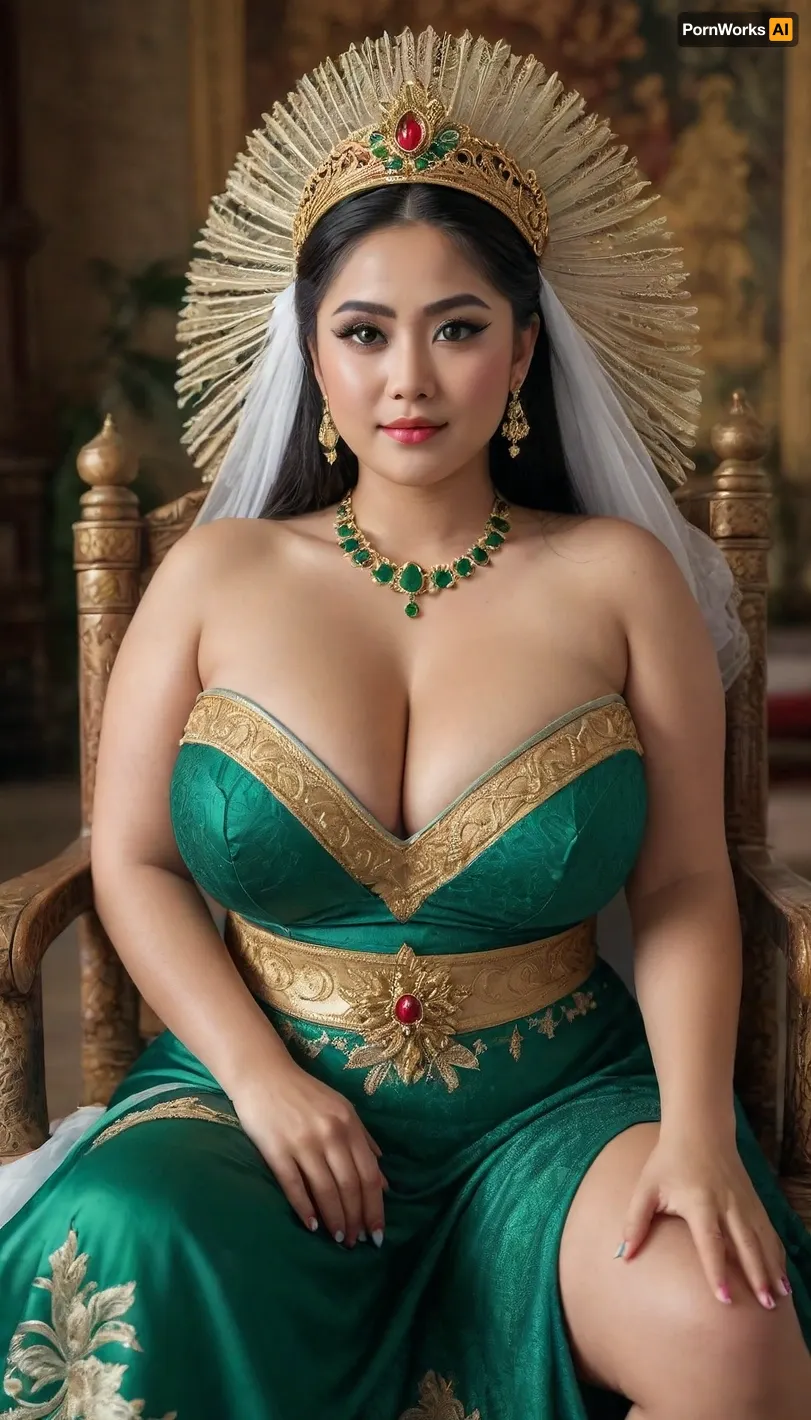 A beautiful woman, (ethnicity, Bali), wearing traditional Javanese wedding attire, (detailed clothing:1.2), emerald green dress adorned with intricate patterns, silver belt, (accessories:1.1), elaborate headdress featuring ornate gold and jewels, floral decorations, (photo model), (realistic), (masterpiece), (chubby:1.1), (perfect body anatomy), (perfect all fingers), centered in the frame, facing the viewer, (sexy chubby body shape), (plump body), natural very big breasts, natural very big tits, ultra realistic photo, realistic, hyperdetailed photograph, slight smile, (expression:1.2), facing the viewer directly, sitting gracefully on a gilded chair, (detailed environment:1.2), studio portrait, vibrant emerald green, gold, and white color palette, photorealistic style, high detail, traditional Indonesian bridal style, formal portrait, (detailed headdress design:1.3), (jewelry detail:1.2), well-lit, refined composition, shallow depth of field, 8k resolution, <lora:milkers_v2:.5> A beautiful woman, (ethnicity, Bali), wearing traditional Javanese wedding attire, (detailed clothing:1.2), emerald green dress adorned with intricate patterns, silver belt, (accessories:1.1), elaborate headdress featuring ornate gold and jewels, floral decorations, (photo model), (realistic), (masterpiece), (chubby:1.1), (perfect body anatomy), (perfect all fingers), centered in the frame, facing the viewer, (sexy chubby body shape), (plump body), natural very big breasts, natural very big tits, ultra realistic photo, realistic, hyperdetailed photograph, slight smile, (expression:1.2), facing the viewer directly, sitting gracefully on a gilded chair, (detailed environment:1.2), studio portrait, vibrant emerald green, gold, and white color palette, photorealistic style, high detail, traditional Indonesian bridal style, formal portrait, (detailed headdress design:1.3), (jewelry detail:1.2), well-lit, refined composition, shallow depth of field, 8k resolution, <lora:milkers_v2:.5>