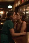 wide angle of TWO LESBIAN FRIENDS with big boobs and cleavage kissing in a bar in the style of the painting by EDWARD HOPPER's Nighthawks