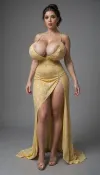 Sexy Tall hourglass brunette in a short yellow sundress with flower pattern, messy bun brunette, massive breast, deep cleavage, hyper colossal mega nipples mostly visible, bimbo heels, slit in dress, no panties, moaning, sitting legs spread, visible pussy