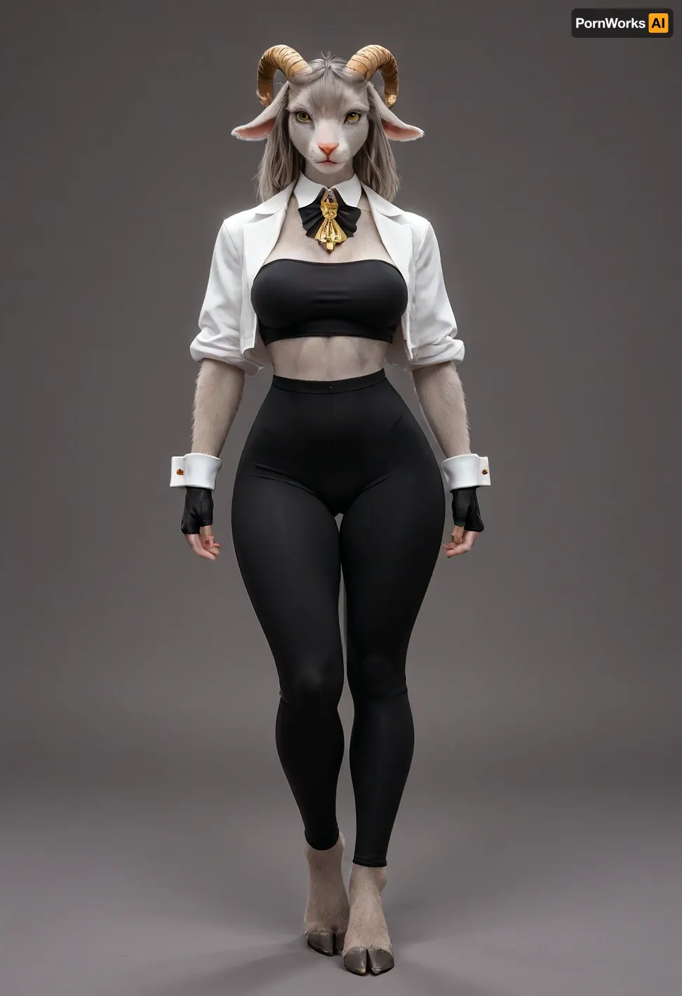 (((Sybil from Pseudoregalia))), (((furry:1.5))), (((anthropomorphic bunny-goat girl:1.5))), (((sleek gray fur:1.5))), long_floppy_goat_ears, (((hooves instead of feet))), large expressive blue eyes with dark lashes, angular golden antler-like horns, tall athletic build, toned and fit body, narrow waist, wide hips, medium to large breasts, strong thighs, long gray tail with tufted tip, elegant neck, sharp facial features, wearing a tight black sleeveless bodysuit that accentuates curves, short cropped white jacket with rolled-up sleeves and gold cuffs, black fingerless gloves, extremely tight black leggings, bare feet, confident and determined expression, fantasy warrior, cel-shaded PS1 style, PlayStation 1 low-poly 3D model look, pixelated textures, flat colors, early 3D video game style, low resolution textures, vertex lighting, crunchy polygon edges, nostalgic retro fantasy game character, full body front view, neutral simple background (((Sybil from Pseudoregalia))), (((furry:1.5))), (((anthropomorphic bunny-goat girl:1.5))), (((sleek gray fur:1.5))), long_floppy_goat_ears, (((hooves instead of feet))), large expressive blue eyes with dark lashes, angular golden antler-like horns, tall athletic build, toned and fit body, narrow waist, wide hips, medium to large breasts, strong thighs, long gray tail with tufted tip, elegant neck, sharp facial features, wearing a tight black sleeveless bodysuit that accentuates curves, short cropped white jacket with rolled-up sleeves and gold cuffs, black fingerless gloves, extremely tight black leggings, bare feet, confident and determined expression, fantasy warrior, cel-shaded PS1 style, PlayStation 1 low-poly 3D model look, pixelated textures, flat colors, early 3D video game style, low resolution textures, vertex lighting, crunchy polygon edges, nostalgic retro fantasy game character, full body front view, neutral simple background