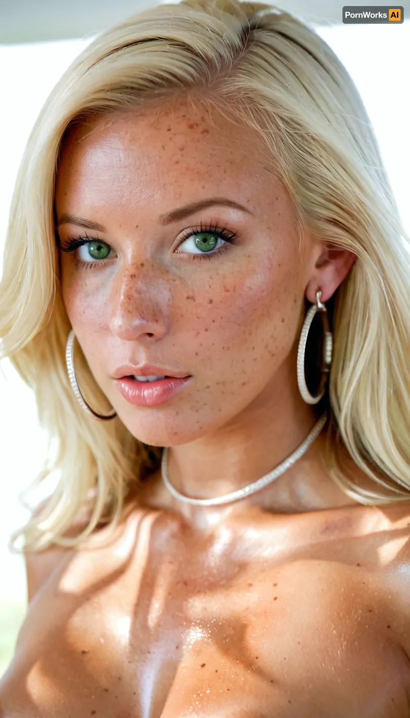 Breathtaking 32 year old woman, petite, smooth silky long hair, platinum Blonde, green eyes, medium fake perky breasts, tanned skin, realistic, glamour, hoop earrings, necklace, detailed, eyes, perfect, freckles, skin, texture, photorealistic, macro shot, depth of field, soft front light, HDR, (muted colors:1.2), Canon RF 100mm F2.8L Macro IS USM, <lora:Super_Eye_Detailer_By_Stable_Yogi_SDPD0:.8>