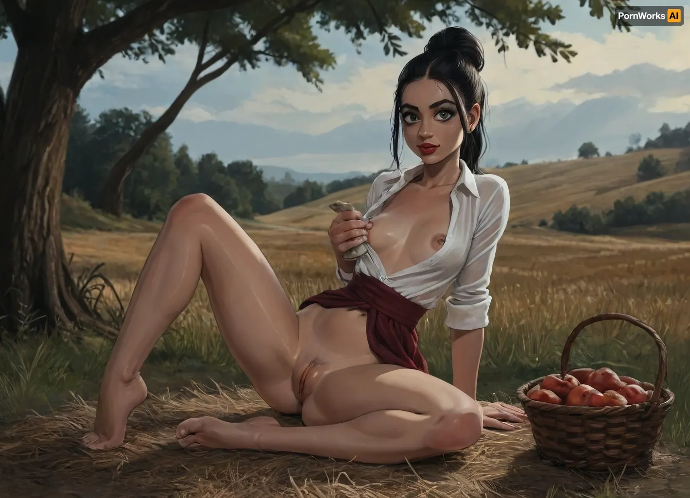 reiq style and Jack cayless art style, 25 yo woman, skinny, large saged breasts, flat chest, black updo haircut, tall, thick thights, long legs, thin waist, green eyes, red lips, (wearing white ukrainian embroidered unbuttoned shirt, black dress, deep neckline, exposed breasts, one breast out, one breast visible), (no panties), (chamomile and viburnum wreath), sitting on haystack on wheat field, clay jug with milk, wicker basket with pies and apples, view from side, spreading legs to the viewer, golden hour sunlight filters through nearby trees, creating dramatic shadows and highlighting her fair skin, looking to viewer, ratatatat74, <lora:EnvyBeautyXL02:1>, <lora:mk_Bp Anime_xl:1>, <lora:EnvyAnimeDigitalPaintingXL01:1>, <lora:ratatatat74-000050:1.9>