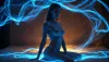 ((masterpiece)), sexy 27yo beautiful woman radiating a bright blue glow, brunette wavy messy big hair, 1990s hairstyle, (wearing glowing white full body lace bodystocking:1.3), ((monochromatic in blue color)), neon tattoos, glow from side, mathematical equations glowing all around, glow, geometry sketches, floating glowing line in foreground, (glowing geometric sketches floating in front of her), mathematical symbols glowing in background, scribbles, award winning image composition, best composition, blue light theme, blue space nebula in a background, good contrast, Fluorescence, Ultraviolet, lighting, uv, tanning, bed, Bioluminescence, glowing, neon, dark, black, body, paint, style, of, Light, painting, ltctr, color, +, light, contour, Photographer, Maren, Klemp, Style, <lora:uv style v2:.5>, <lora:tbh247-sdxl:.9>, <lora:light_contour_sdxl:.6>, <lora:Photographer Maren Klemp Style:.5>