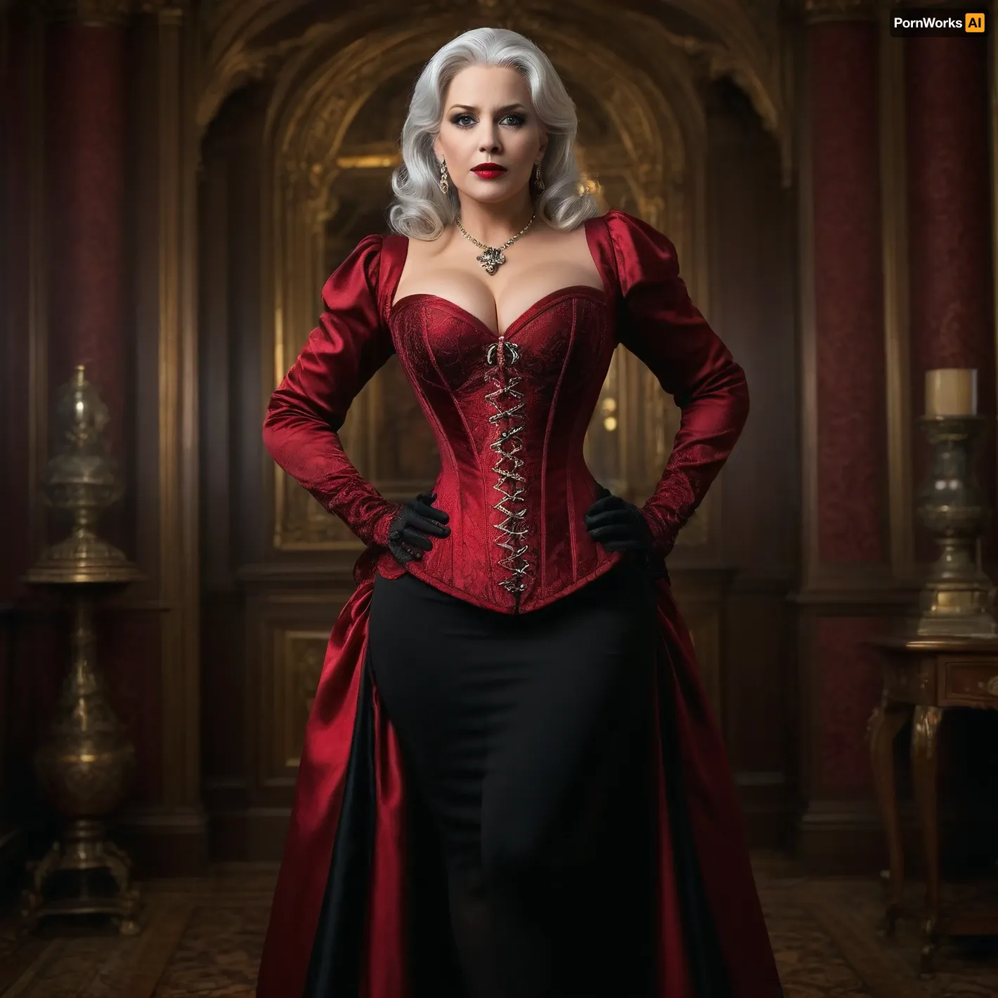 1woman, (Solo, 65 yo, tall, silver hair, victorian mistress, (((huge xxxl tits))), red lipstick, heavy eye shadow, O cup breasts, black high heels, (wearing ornate dark red corset:1.5), full sleeve dark red opera gloves, hourglass body shape, wide hips, very long legs, standing, deep cleavage)