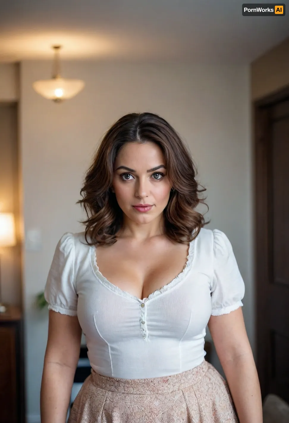 Woman, One, 35 Years old, White, amber eyes, Fat, Big breasts, Big ass, Beauty face, Makeup, Brunette hair, Medium hair, Fluffy hair, Blouse, Cotton skirt, Portrait, Standing Woman, One, 35 Years old, White, amber eyes, Fat, Big breasts, Big ass, Beauty face, Makeup, Brunette hair, Medium hair, Fluffy hair, Blouse, Cotton skirt, Portrait, Standing