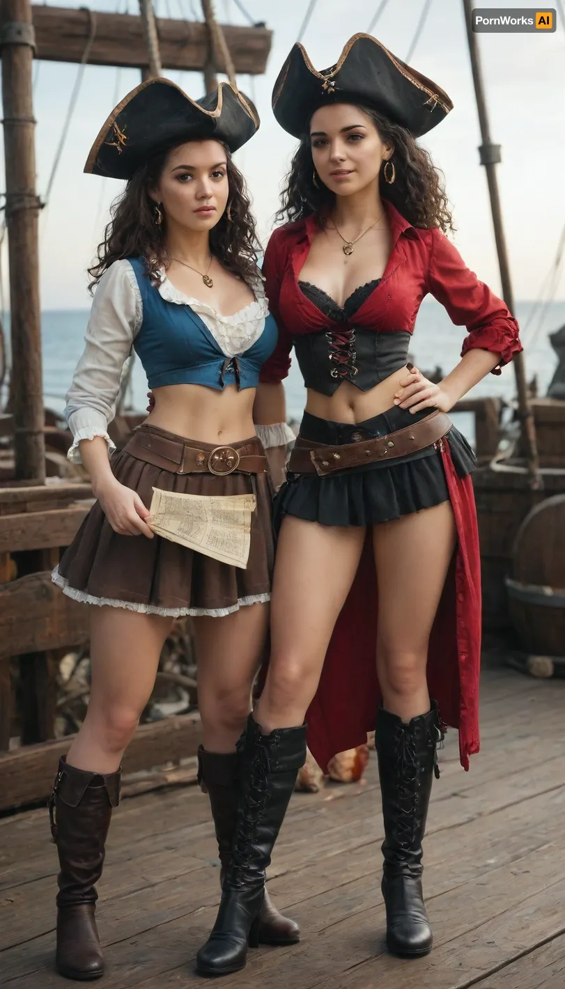Two beautiful pirate women standing on a pirate ship.{woman #1, long curly hair, huge boobs, thicks thighs, wearing a black pirate hat with a red feather on it, a black pirate one eye patch, holding a map, wearing a black, red, and blue corset with a black bow in the middle, long pirate black boots, wearing a mini ruffle brown skirt, thigh high black socks, a parrot on her shoulder} {Woman #2, long straight black hair, tiny blue skirt, wearing a black and red cropped blouse, long pirate brown boots, large boobs, holding a telescope, gold necklace} Two beautiful pirate women standing on a pirate ship.{woman #1, long curly hair, huge boobs, thicks thighs, wearing a black pirate hat with a red feather on it, a black pirate one eye patch, holding a map, wearing a black, red, and blue corset with a black bow in the middle, long pirate black boots, wearing a mini ruffle brown skirt, thigh high black socks, a parrot on her shoulder} {Woman #2, long straight black hair, tiny blue skirt, wearing a black and red cropped blouse, long pirate brown boots, large boobs, holding a telescope, gold necklace}