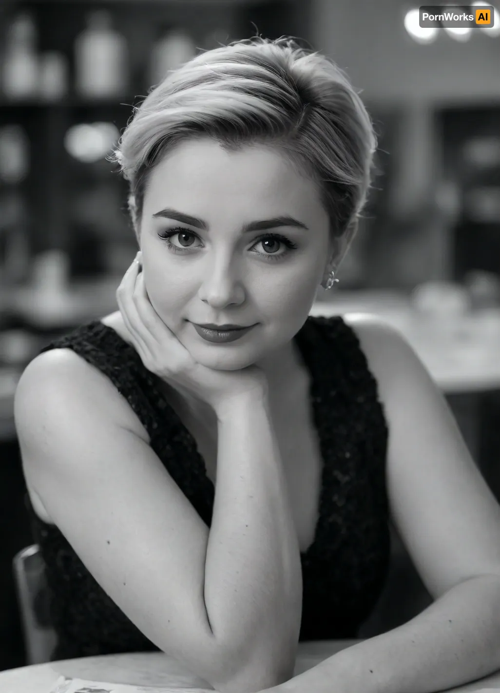 a close up portrait photo of 30 y.o woman, blonde, French, chubby, (Sassy Undercut Pixie:1.2), pale skin, detailed skin, sitting, face closeup, 90s clothing, vintage coffee shop, chiaroscuro lighting, eye level, brown eyes, long natural eyelashes, smiling eyes, tender smile, (round cheeks:1.5), small mouth, thin pale lips, upright nose, wrinkles, moles, shot onlarge format, Agfa 400, ((black and white:2)), ((view in 3/4:2)), bokeh, no makeup, in style of Miles Aldridge, <lora:peopleneg:.5> a close up portrait photo of 30 y.o woman, blonde, French, chubby, (Sassy Undercut Pixie:1.2), pale skin, detailed skin, sitting, face closeup, 90s clothing, vintage coffee shop, chiaroscuro lighting, eye level, brown eyes, long natural eyelashes, smiling eyes, tender smile, (round cheeks:1.5), small mouth, thin pale lips, upright nose, wrinkles, moles, shot onlarge format, Agfa 400, ((black and white:2)), ((view in 3/4:2)), bokeh, no makeup, in style of Miles Aldridge, <lora:peopleneg:.5>