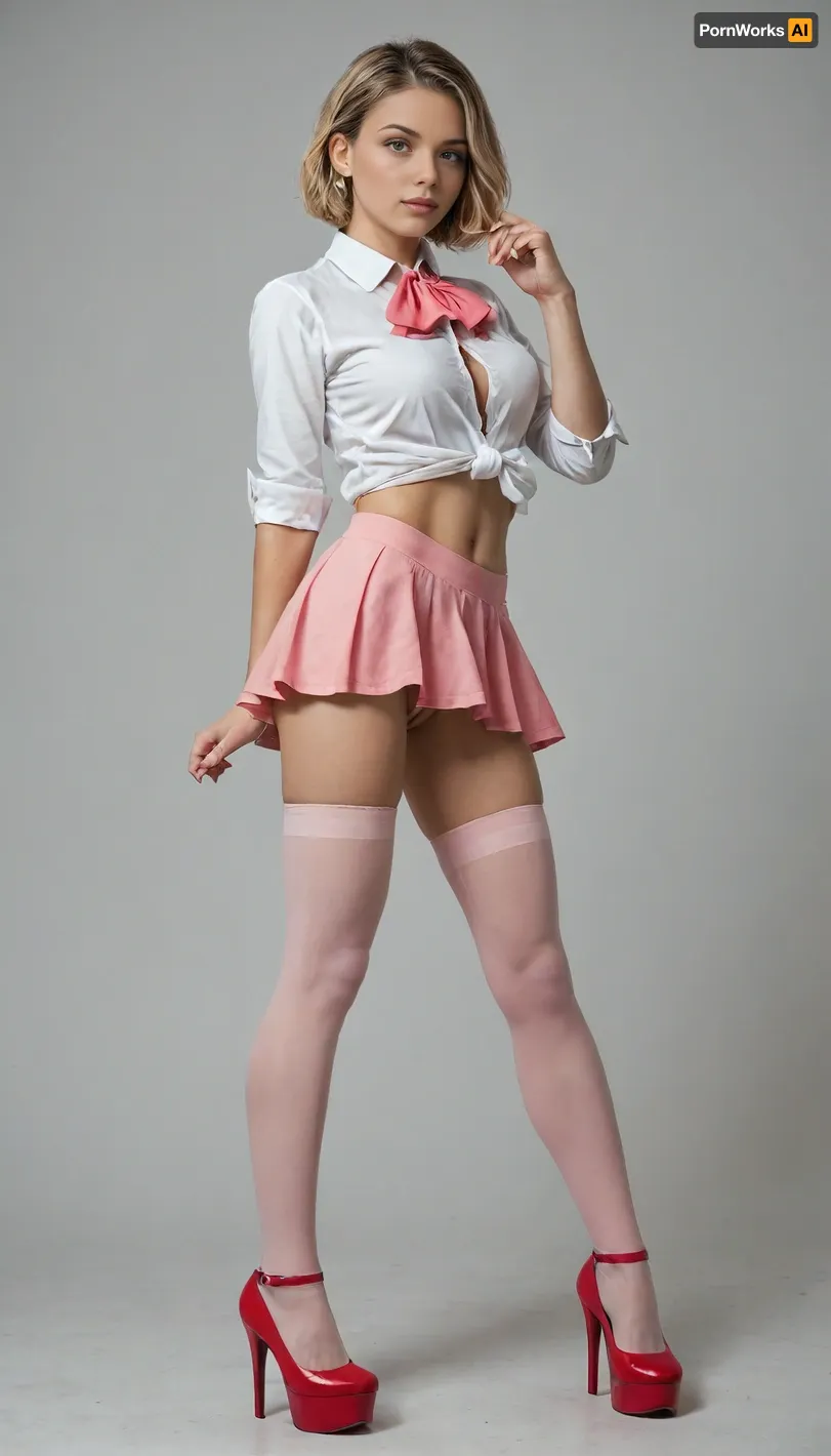 masterpiece, best quality, very awa, very aesthetic, newest, thick outlines, very detailed, 1girl, 1man, standing, beautiful, cute, kawaii, Elle, adult face, short blonde bob cut, big blue eyes, beautiful face, toned body, white unbuttoned shirt, tits visible, ascot, pink mini skirt, pink mini-skirt, upskirt, no underwear, pussy visible, pink thigh highs, high heels on platform, hair bow, highly detailed, intricate, cute pose, modelshoot, abstract background, petite, perfect body, medium perky tits, sexy pose, seductive, medium perky breasts, innie pussy, cowboy shot, shadows, dynamic angle, dutch angle, dramatic lighting, cinematic lighting, very fat old man, man grap girl butt, full body view