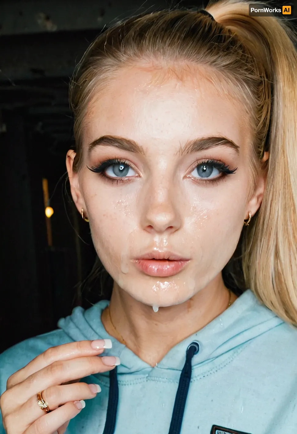 Breathtaking extremely junior Slim tall natural blonde, swimwear, long natural hair, slavic, gold ring earrings, thin eyes, sweaty, perfect body, slim waist, detailed, perfect anatomy, model, photo, core, eyecontact, photography, tall, slender, glistening skin, blue and grey colored mesmerizing eyes, perfect skinny body, small perky breasts, perfect face, smooth silky long hair, tanned skin. Black eyeliner. Heavy bronze eyeshadow. BREAK Fully clothed in, (pink baggy college hoodie:1.2), . realistic eyes. she gently suggestively bites on her index fingernail. Sultry expression. Tousled, high ponytail. Eye contact, (sultry), confident. Petite, athletic, sweaty. Photorealistic. Viewer at eye level, close up. In a poorly lit, rundown basement of a derelict building. Close up, 35mm SLR, 50mm f/1.8 lens, Kodak Portra 400 color film. Nostalgic, film-grain aesthetic., with an overall underexposure of 1-2 stops to accentuate the darkness and isolation of the environment. Close-up on face. Soft backlight. Look, at, my, prompts.