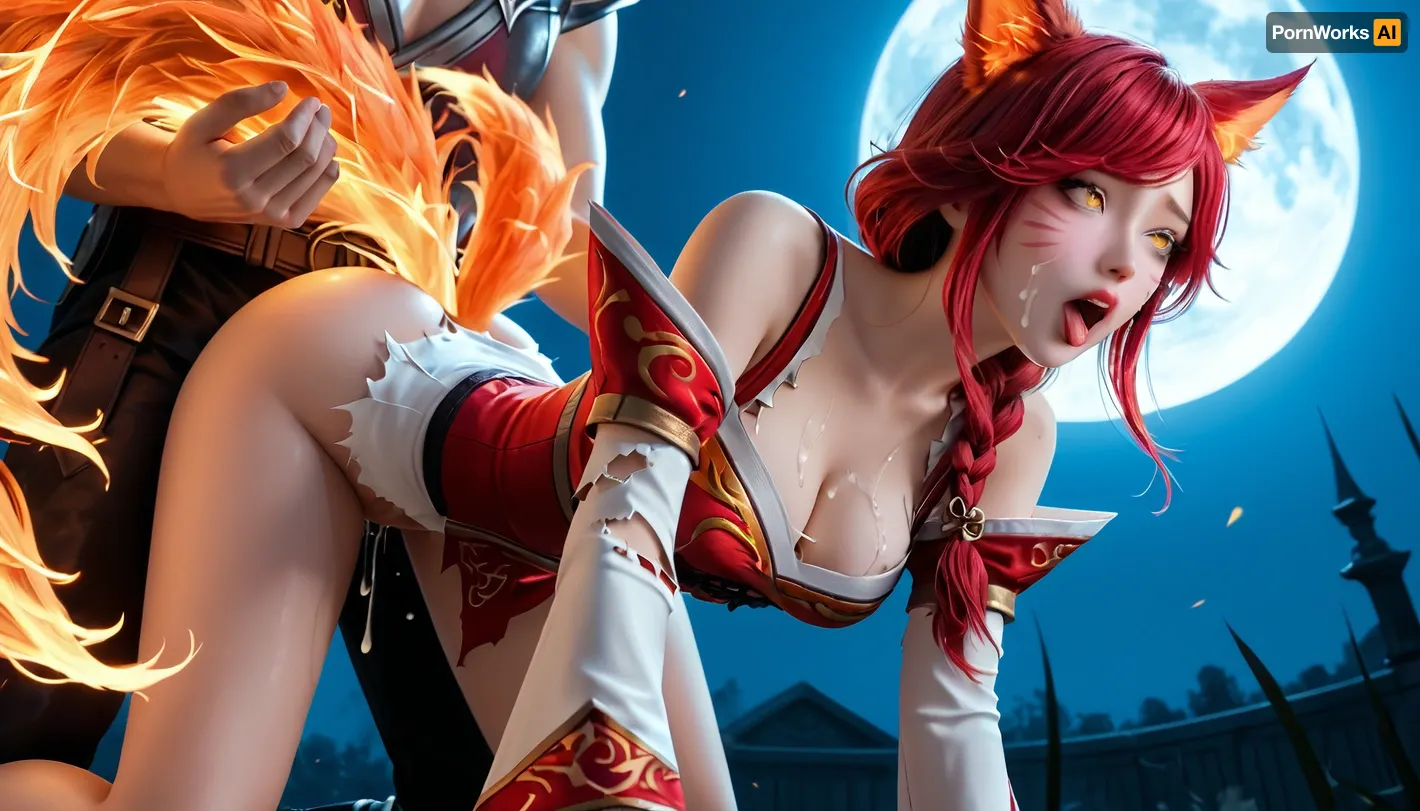 Foxfire Ahri from league of Legends, Dark Red hair, Braided Ponytail, slender body, medium breasts, Fiery fox tails, ripped clothes, ahegao, Below view, glowing yellow eyes, sex from behind, getting fucked by human man, Doggystyle, big dick, cum in pussy, cum on ass, cum on face, cum on breasts, full moon background, ultra detail, (((Dark Red hair:1.3))), (((Fiery Fox Tails:1.3))), (((On hands and knees:1.2))), (((sex from behind:1))), (((ripped clothes:1.4))), ahri, 1girl, long, hair, animal, ears, whisker, markings, korean, clothes, cleavage, detached, sleeves, <lora:ahri_sdxl_lowlearningrate-000024:.8> Foxfire Ahri from league of Legends, Dark Red hair, Braided Ponytail, slender body, medium breasts, Fiery fox tails, ripped clothes, ahegao, Below view, glowing yellow eyes, sex from behind, getting fucked by human man, Doggystyle, big dick, cum in pussy, cum on ass, cum on face, cum on breasts, full moon background, ultra detail, (((Dark Red hair:1.3))), (((Fiery Fox Tails:1.3))), (((On hands and knees:1.2))), (((sex from behind:1))), (((ripped clothes:1.4))), ahri, 1girl, long, hair, animal, ears, whisker, markings, korean, clothes, cleavage, detached, sleeves, <lora:ahri_sdxl_lowlearningrate-000024:.8>