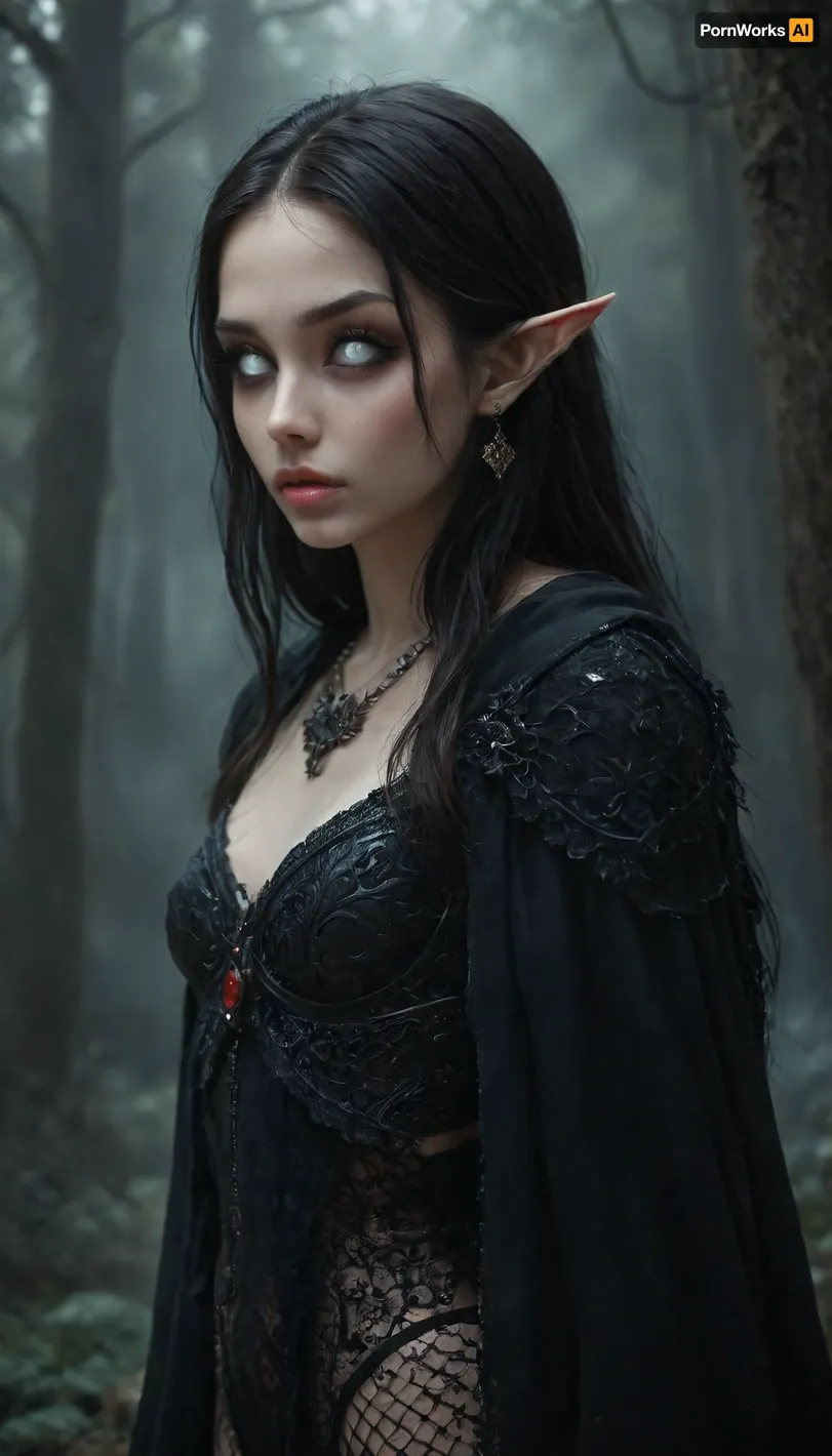 (1 extremely evil elf girl standing in a dark eerie forest:1.4), (close up angle:1.4), (side view), big thin cute lips, (extremely small beautiful face:1.3), black hair, (extremely long hair), extremely straight hair, (beautiful black fishnet armor:1.4), fully clothed, white skin, very long thick eyelashes, (light white eyes), (extemely beautiful petite body:1.4), collarbones, multiple big necklace, earrings, (cute tiny breasts), small waist, bubble butt, (extremely thin petite thighs), long legs, (extremely perfect big beautiful eyes:1.8), (perfect face), 8k, (dark evil forest), white, sclera, eyes, R3g4l, 3lv3n, woman, courtyard, armor, cloak, sword, castle, Dark, dreams, Eerie, reality, Horror, Darkness, <lora:white sclera v2:1.3>, <lora:rknArouseXL:.4>, <lora:Regal_Elven:1>, <lora:1366408_training_data:.8>, <lora:DDXL:1>