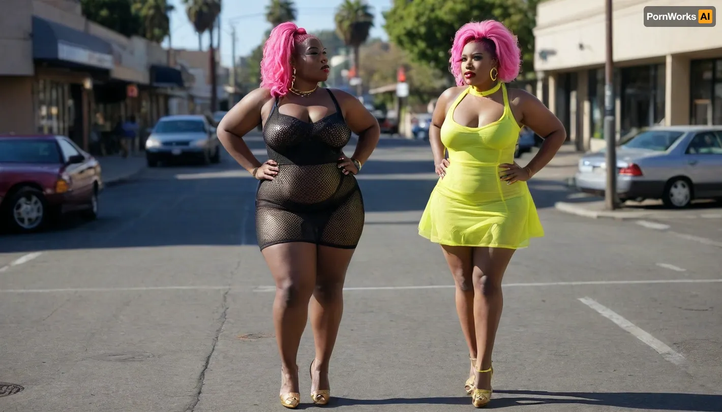 black ssbbw bbw hooker prostitute pink hair yellow neon see through neon yellow mesh webbing dress high heels hoop earrings pierced nose and lips gold Oakland outside streets daytime fruitvale soliciting cars the blade