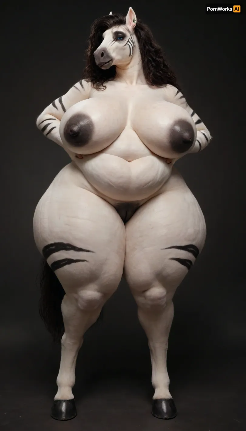 woman, ((Anthro, Character_tanya-winters_crowchild)), dark background, FULL BODY, huge breast, sexy chubby girl, alone, long horse face, nude, body covered in deep white fur, dark zebra stripes throuout fur, soft fur, very bright blue eyes, big tits, looking away, black lips, black lipstick, purple eyeliner, smooth fur, (black background), (perfectly scaled up:1.1), big saggy tits, very wide hips, thick thighs., ((huge tits, floppy tits, thick protruding nipples black nipples)), black vagina, long black maine, full lips, ((wide, very wide hips, thick cellulite hips)), ((belly bulges and sags, deep navel, thick cellulite belly)), super wide huge hips, fursuit, flabby belly, <lora:milkers_v2:.7>, <lora:Fur:.8>, <lora:FursuitXL:.8>, arabian, horse, friesian, centaur, <lora:Horsesv2:.8>