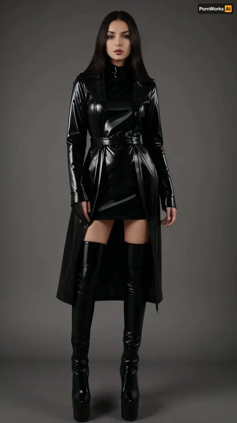 Belgian brunette, (long black latex coat:1.1), high heel platform boots Belgian brunette, (long black latex coat:1.1), high heel platform boots