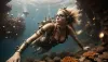 Bir slender, spor vücut ve gerçekten düz, küçük çerçeve suya rahatlatır, onun yüzen sarışın saçları onun etrafında sallanır. O biraz açık bir fantezi buharlı dalış giyiyor, eğrilerinin bir ipucunu yüz yüzen canlı bir mercan resifi renkli balıklarla ve mercanlarla dolu. Uzakta, evinin geniş bir atış, bir buharlı denizaltı, okyanusun derinliklerinde yüzler serenely. Bubbles onu zorlu bir şekilde atladığı gibi çevreledi, lensi aracılığıyla huzurlu su dünyasını ele geçirdi. Sahne, karmaşık buhar makineleri ile süslenmiş bir sualtı mağarası içinde ayarlanır, fantezi ve buhar elementleri sorunsuz bir şekilde birleştirir.