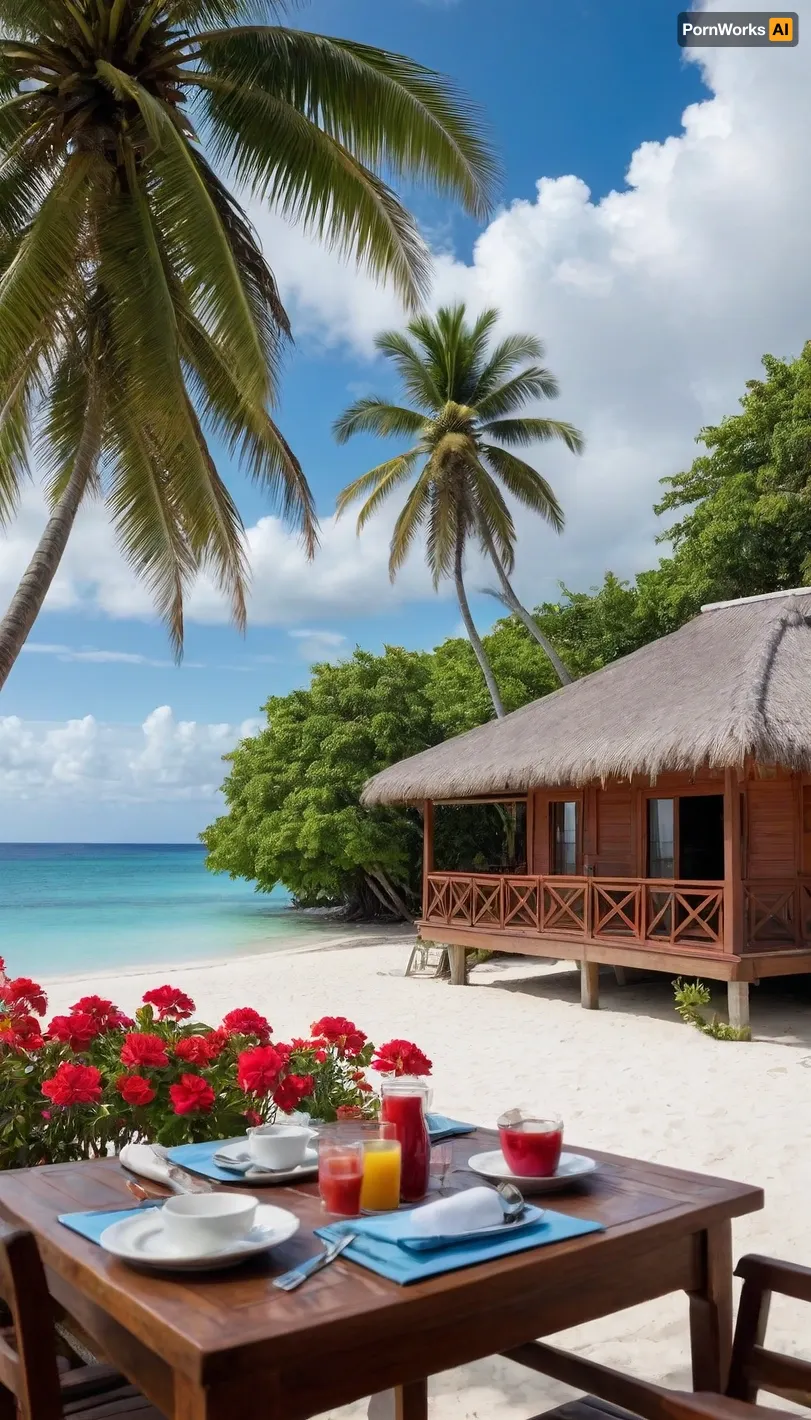 5000000010.70, A wooden bungalow, a breakfast table by the sea, surrounded by red flowers and green palm trees. The blue sky with white clouds in the background creates an exotic tropical island landscape with a view of the Caribbean Sea and a white-sand beach. This is a beautiful high-resolution nature photo suitable for wallpaper. 5000000010.70, A wooden bungalow, a breakfast table by the sea, surrounded by red flowers and green palm trees. The blue sky with white clouds in the background creates an exotic tropical island landscape with a view of the Caribbean Sea and a white-sand beach. This is a beautiful high-resolution nature photo suitable for wallpaper.