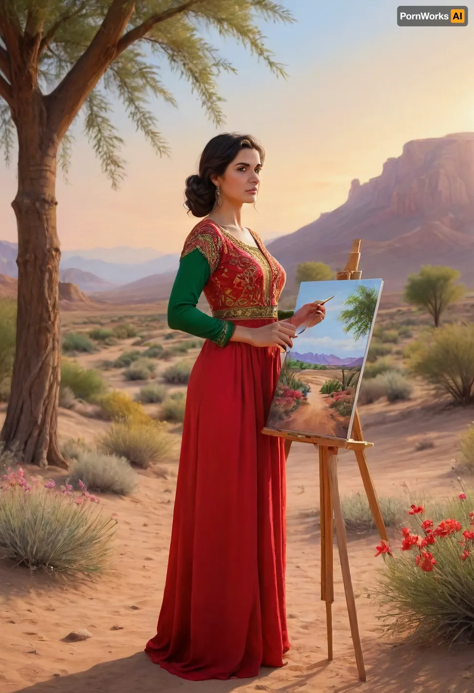 A iranian woman in traditional dress, (red, green, flowing, embroidery garments that catch the warm, golden light of the setting sun.), standing in a vast desert panorama at sunset, actively painting a vibrant and lush Garden of Eden scene, (The Garden of Eden painting depicts rich greenery, blooming flowers, exotic trees, and gentle animal, swiss panorama, daylight, oil painting), on a large canvas set on an easel . Around her, the desert stretches endlessly with soft sand dunes and sparse vegetation, contrasting sharply with the vivid, colorful paradise she is creating on the canvas. The sky is a dramatic blend of oranges, pinks, and purples, casting long shadows and a serene glow over the scene. The composition captures the contrast between the barren desert and the flourishing garden in the artwork, emphasizing themes of creativity, hope, and transformation. The style is of hyperrealism, with meticulous detail in both the desert environment and the painted Garden of Eden, creating a visually striking and emotionally evocative image. The framing is a wide-angle view that encompasses both the woman artist and the expansive desert, with a focus at the glowing canvas she is bringing to life. The mood is contemplative and inspiring Solo, detailxl, Artist, painter, big breast, Black hair, tanned, golden hour, paint, detailed, skin, blemish, flux-scenery, <lora:706606_training_data:.8>, <lora:add-detail-xl:.8>, golden, hour, sunset, sunrise, <lora:polyhedron_golden_hour_000006:.8>