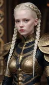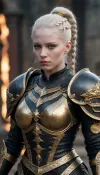 Tense Young Dark Female albino Warrior for the God of Chaos and War in fearsome and also beguiling wealthy expensive ornamated pomp splendor pageantry magnificence opulence, sumptuousness heavy armor in very black and bright gold with piquant insights. One very elegant braided ponytail, the whole appearance radiates dominion rule reign dominance power control, She carries the ceremonial helmet under her armpits. She stands as a shining centerpiece on a fantasy medieval raging bloody cruel crowded battlefield. Tense Young Dark Female albino Warrior for the God of Chaos and War in fearsome and also beguiling wealthy expensive ornamated pomp splendor pageantry magnificence opulence, sumptuousness heavy armor in very black and bright gold with piquant insights. One very elegant braided ponytail, the whole appearance radiates dominion rule reign dominance power control, She carries the ceremonial helmet under her armpits. She stands as a shining centerpiece on a fantasy medieval raging bloody cruel crowded battlefield.