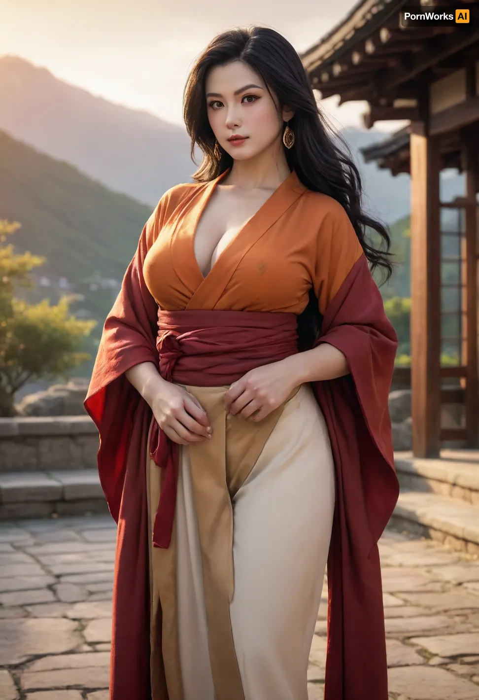 Dragon Ball character Chi-Chi, re-imagined as a strong, old graceful woman in her 50s, milf woman, chubby, big tits, busty figure, horny, seductive pose, standing in the courtyard of her mountain home at sunset. Her long black hair flows in the wind, and she wears a deep red kimono with gold accents. Her eyes are calm but intense, carrying years of strength and wisdom. Warm orange sunlight highlights her face, soft mist drifts around the mountains behind her. Cinematic lighting, painterly anime realism, ultra-detailed textures, emotional atmosphere, high-resolution 4K illustration.