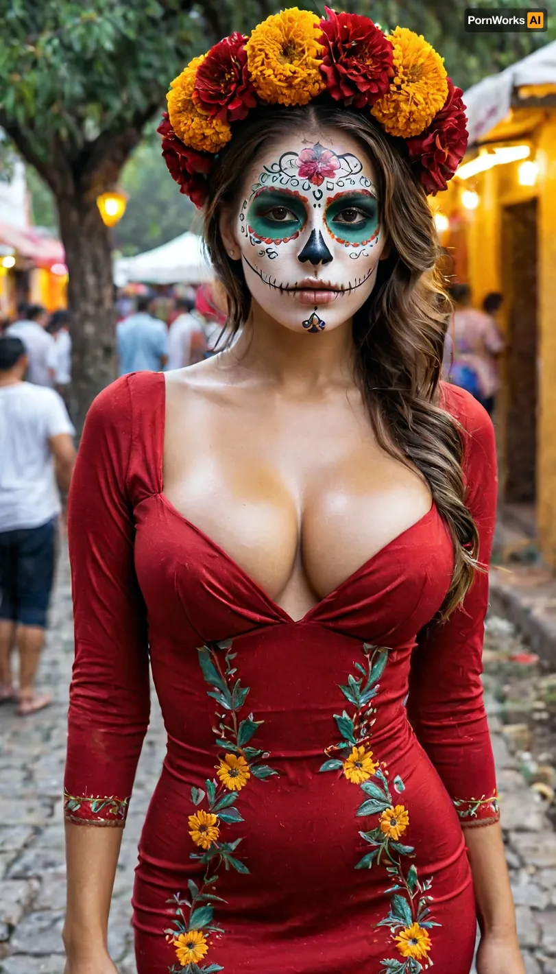 intricate details, A 25 years old mexican, the most beautiful woman, (mexican skull face paints), seductive, white and tan wet skin, flat booty, slender, 8k uhd dslr high quality, spanish, pointy nose, insanely detailed photo, highest quality, detailed skin texture, masterpiece, 4K, (very haircut), slim body, updo hair, light brown hair, big rounded breasts, woman, hairstyle, fully dressed, ((sexy tight embroiderd red dress)), ((marigold wreath upon head)), (full body view), very large breasts, standing close to the tree, outdoors, ((night of the dead mexican street festival)), night time, view from front, pose standing, open blouse, breasts fully hanging out, insanely detailed photo highest quality detailed skin texture photography highly detailed sharp focus intricate details realistic perfect eyes detailed eyes realistic eyes sharp face, (detailed face paint), perfect legs, naturtal skin skin pores, very wet face, wet body, very wet legs, very wet pussy, vet clothes, wet hair, perfect hands, <lora:add-detail-xl:1>, <lora:xl_more_art-full_v1:.5>, <lora:RMSDXL_Enhance:.8>, movie, still, film, cinematic, shot, lighting, macro, 35mm, green, eyes, blue, brown, close, up, teeth, braces, <lora:AdvancedEnhancerXLv2:.8>, aesthetic, <lora:aesthetic:.8>