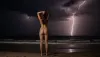 *at night on a beach overlooking the ocean, on a stormy night with amazing lightning*, pitch black, no light, darkness, one young beautiful busty girl, in the rain, completely soaked, standing with legs slightly apart and hands behind the head, seen from back, completely naked, sweaty, petite, Tinymodel, petite body, small size, long, straight brown hair flowing in the wind, photorealistic, award-winning photo, professional lighting, masterpiece