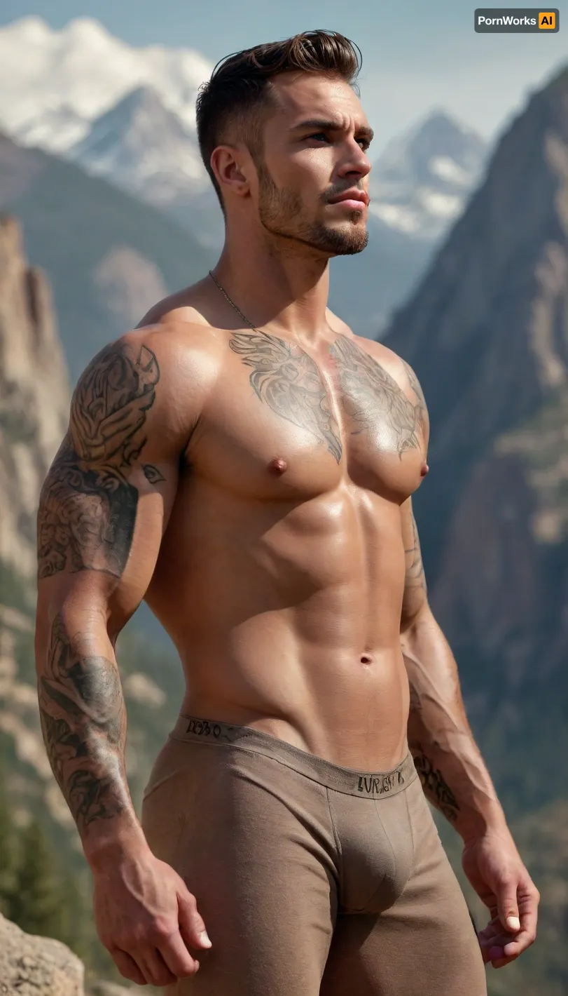 High quality, 4K, 8K, extreme details, realism, photo-realistic, HDR, UHD, professional studio lighting, extreme painting, sharp focus, physically based rendering, professional, vivid and colorful, soft focus, a young and tough man, bronze muscular body, ancient tattoos covering his body, magnificent mountain background