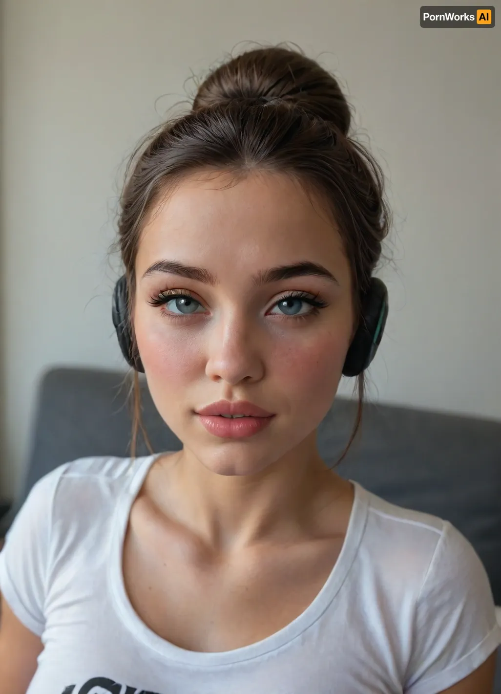 Kiriko, beautiful young adult, gorgeous, cute, extremely sexy face, (sensual eyes:1.5), seductive eyes, (most beautiful eyes:1.2), (sexy eyes:1.6), (upturned eyes:1.5), (seductive eyes:1.5), protruding eyes, (very bright grey eyes:1.2), perfect female face, beautiful female model, smoky makeup, (perfectly shaped lips:1.3), full lips, round cheeks, short chin, (small cute nose:1.1), slim neck, horny expression, happy, (looking at viewer like a satisfied flirtatious slut:1.2), on set of photoshoot, (tanned:1.3), (messy bun:1.8), headphones, (gamer girl t-shirt:1.2), athletic, tight body, sixpack, muscular abdomen, midriff, muscular thighs, muscular ass, small tight ass, perfect round ass, very small erect nipples, (huge natural perfectly shaped breasts larger than head:1.5), thigh gap, (smooth pretty tidy godpussy:1.4), spreading legs, (looking at viewer:1.6), (game screen in background:1.4), close