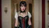 Bir gothic kıyafetinde giyinmiş siyah bir kadının tam bir portresi, deri, kumaş ve dantel içeren karmaşık tasarımları içeren. Kısa elbise eğrilerini aksır, küçük göğüslerini çıplak bırakır. Onun stokları ve yüksek botlar cesur estetike eklenir, Fujifilm kurulumu derin siyahlar ve ince ışıklar yakalarken, çarpıcı güzelliği ve attire'nin sanatsal zanaatkarlığı gösterir.