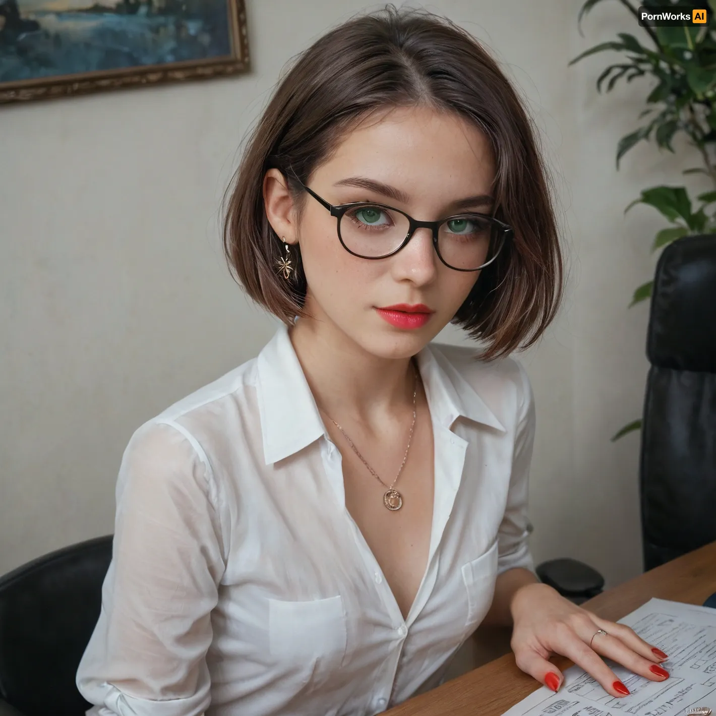 portrait of a beautiful sexy senior executive, 30 years old girl, (skinny), brown hair, bob cut, symmetric green eyes, glasses, eye contact, red nails, lipstick, rings, necklace, strict, (closed white blouse), dark skirt, sitting on top of an office desk, flat, chest, <lora:ahxl_v1:1>, <lora:add-detail-xl:1>, from front, masterpiece, hyperrealistic photo, best quality portrait of a beautiful sexy senior executive, 30 years old girl, (skinny), brown hair, bob cut, symmetric green eyes, glasses, eye contact, red nails, lipstick, rings, necklace, strict, (closed white blouse), dark skirt, sitting on top of an office desk, flat, chest, <lora:ahxl_v1:1>, <lora:add-detail-xl:1>, from front, masterpiece, hyperrealistic photo, best quality