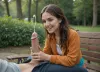 brunette woman in black formal dress sits on a bench in the park, a man standing infront of her with his pants down to his knees, has his huge big cock out and masturbates infront of the woman, big large penis, massive cock