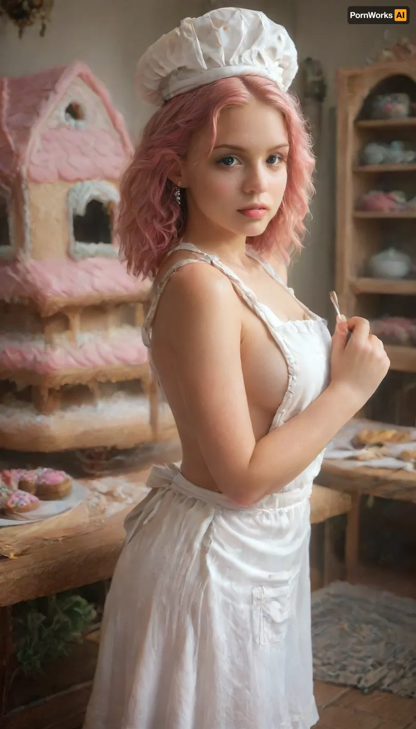 A beautiful girl pastry chef, pink hair, white apron with side boob, ((bakes a gingerbread house)), cottoncandy, Candy, Land, gingerbread, house, <lora:SDXLCottonCandy:.5>, <lora:Candy_land_2:.5>, <lora:Pink_Lips:.5>, <lora:Gingerbread_Houses_SDXL-000007:1.5>