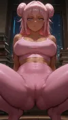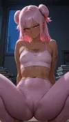 1girl, dark skin, sweaty, drooling, dragon tattoo on chest, pierced ears, gray eyes, angry, short pink hair in a messy bun, flat chest, pink cropped tank top, erect nipples, legs spread, riding dildo, very hairy pussy, pubic hair, cozy urban home apartment with pink and blue neon lights, scattered stacks of books, moonlight shining through window, squatting, soft focus, realistic, detailed, high quality, high contrast, low light, highly detailed, rim lighting